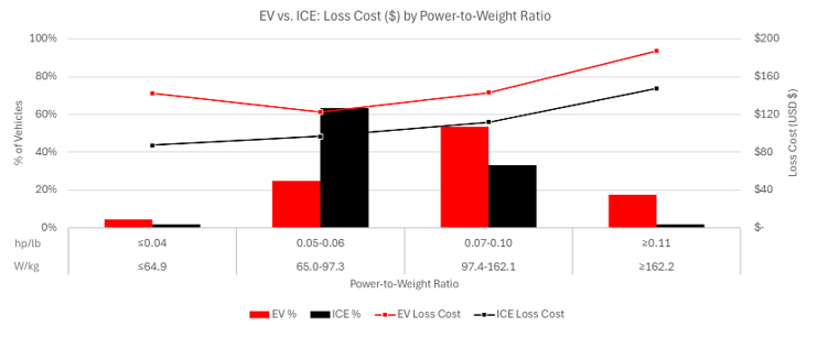 此图表比较了内燃机汽车和电动汽车在电机 / 发动机功率(马力)与车辆重量(磅)的比率(X 轴)方面的车辆分布(左 Y 轴)以及平均损失成本(右 Y 轴)情况。在整个功率重量比范围内,电动汽车的损失成本(红线)都高于内燃机汽车的损失成本(黑线)。电动汽车的分布(红色条形)偏向右侧(更高),而内燃机汽车的分布(黑色条形)偏向左侧(更低)。