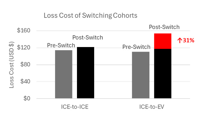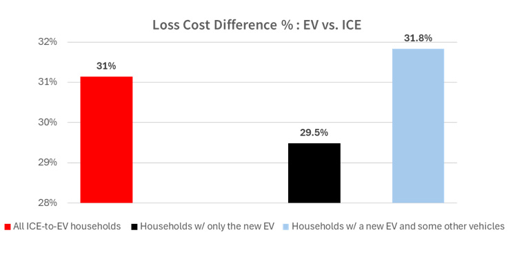 此图表展示了新购买电动汽车且没有其他车辆的家庭,与新购买电动汽车但也拥有其他车辆(很可能是内燃机汽车)的家庭相比,其电动汽车损失成本的差异,并与那些购买新内燃机汽车的类似家庭进行了比较。混合驾驶电动汽车和内燃机汽车的风险更高,因为这会减缓新驾驶员对电动汽车的适应速度,并在紧急情况下造成混乱。