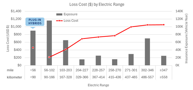 正如预期的那样,律商风险的研究表明,电动汽车的续航里程越高,其理赔损失成本就越高。插电式混合动力电动汽车(PHEVs)是个例外。尽管插电式混合动力电动汽车的续航里程通常在 50 英里或以下,但它们内置的汽油发动机可以让车辆行驶更远的距离,这就导致了更高的理赔损失成本。
