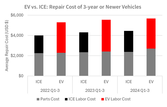 根据 CCC 2024 年第四季度碰撞课程报告,电动汽车维修所需的精细程序往往会导致更多的维修工时,进而导致更高的人工成本。一些电动汽车存在可修复性问题,例如对于一些轻微损坏,可能需要更换整个电池组或车身面板,这反过来又导致了更高的零部件和人工成本。