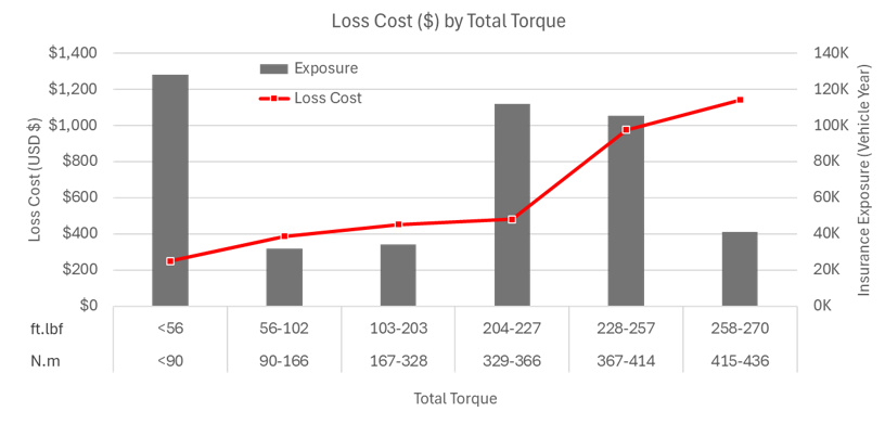 此图表展示了电动汽车碰撞险的损失成本(左 Y 轴)与其电动机总扭矩(X 轴)之间的相关性。电动汽车的损失成本(红线)随着总扭矩的增加而增加。电动汽车的分布用其在不同总扭矩下的保险风险敞口(黑色条形)表示。保险风险敞口(右 Y 轴)是车辆数量乘以其保险期限的乘积之和。