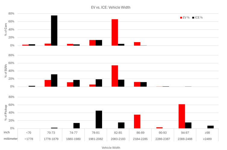 此图表比较了内燃机汽车(用黑色条形表示)和电动汽车(用红色条形表示)的车辆宽度分布情况。在上(轿车)、中(SUV)、下(皮卡)三张图表中,电动汽车的宽度分布偏向右侧(更宽),而内燃机汽车的宽度分布偏向左侧(更窄)。