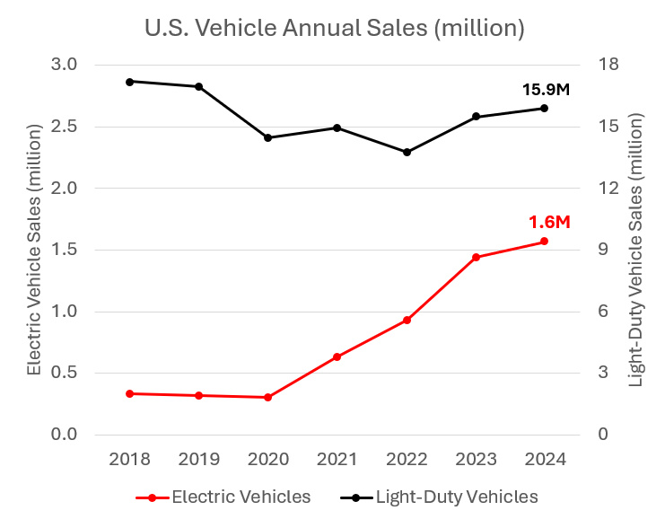 此图表展示了自2018 年以来新车的年度销售量。黑线代表轻型车辆,包括重量在 8500 磅或以下的轿车、运动型多用途汽车(SUV)和皮卡。红线代表电动汽车(EVs),包括纯电动汽车(BEVs)和插电式混合动力电动汽车(PHEVs)。此图表是根据阿贡国家实验室(Argonne National Lab)发布的月度汽车销售数据制作的。