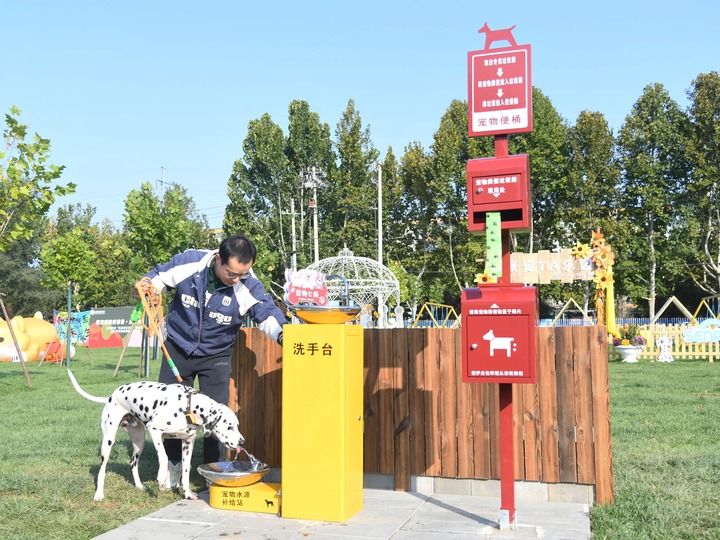 10月22日,在北京市平谷区王辛庄镇的宠物友好型公园,宠物狗在饮水处喝水。新华社记者 任超 摄