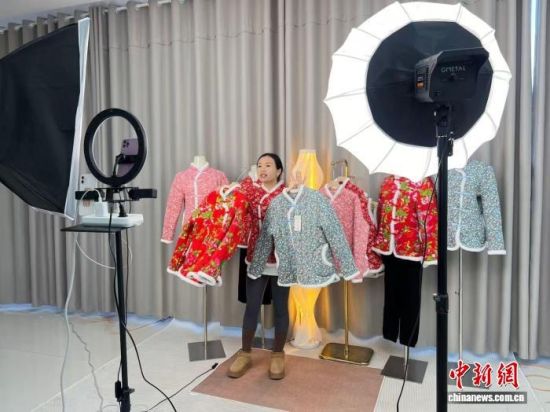 在聊城市东昌府区侯营镇,工作人员正在直播销售棉服产品。张宇宁 摄