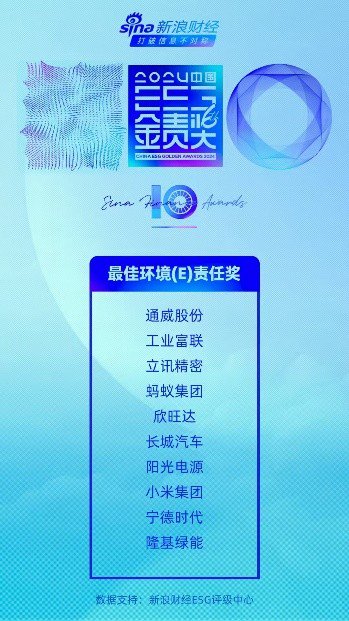 1月16日,由新浪财经主办的2024中国企业ESG“金责奖”评选结果揭晓。工业富联凭借在ESG行动和绩效方面的卓越表现,荣获“年度可持续发展奖”与“最佳环境(E)责任奖”。