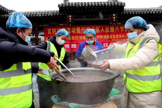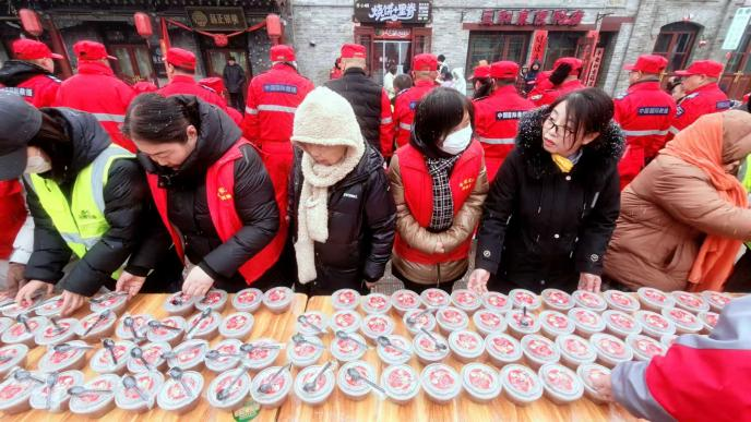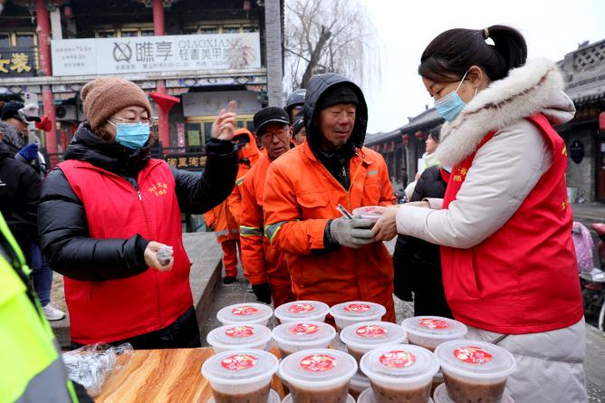 1月25日,山西省晋中市太谷区心连心志愿者协会举办的以“浓情腊八粥,冬日暖人心”为主题的腊八公益行动,在太谷古城白塔游园广场温情启幕。