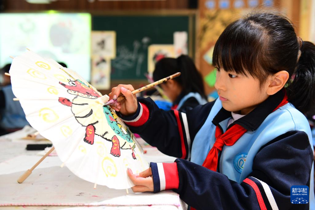 11月25日,在济南市市中区爱都小学,来自市中区艺术教育基地的徐子芯老师教学生们做漆扇。