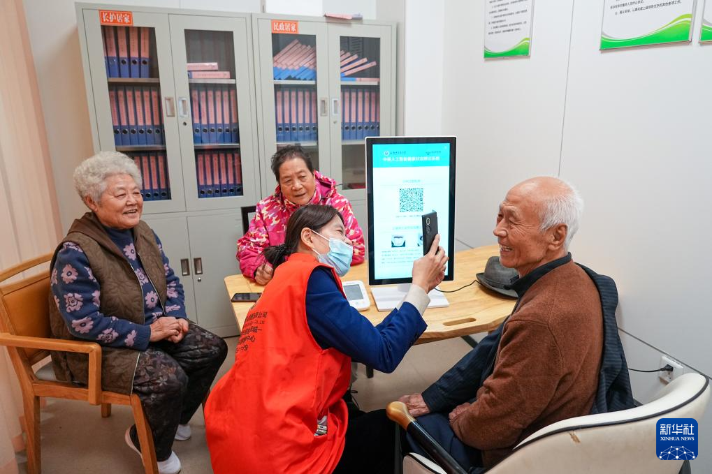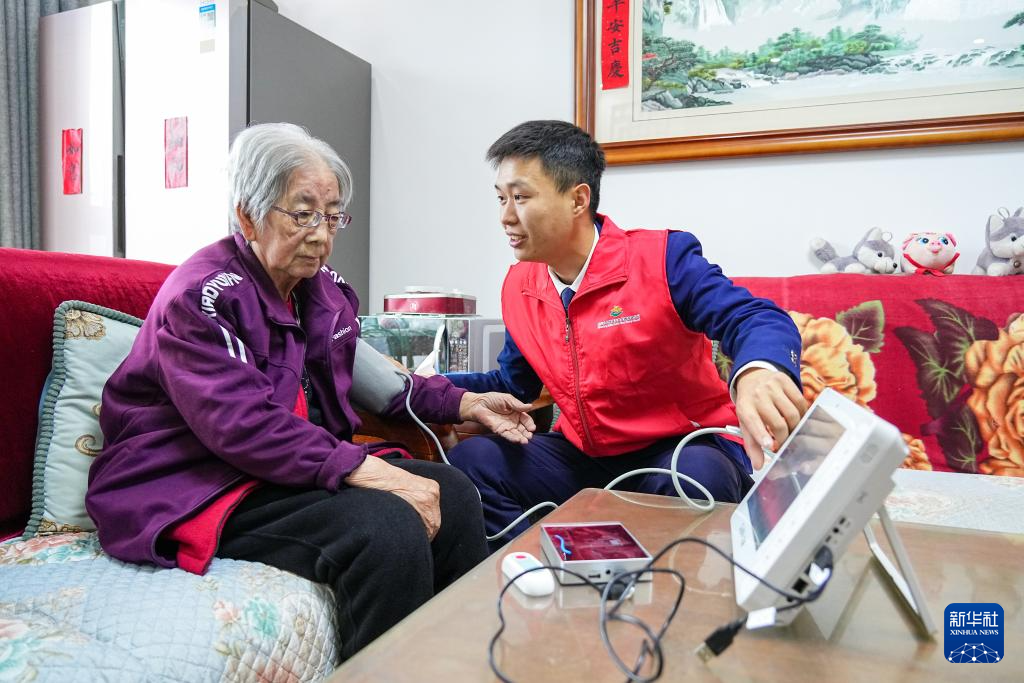 10月23日,养老服务员在淄博市张店区马尚街道金石社区上门开展每日健康监护服务,相关数据可同步到老人亲属手机上。新华社记者 朱峥 摄