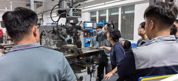 一台铣床前,培训师正耐心教授学生用铣刀侧刃对工件进行平面铣削,随后告知需要加工的尺寸要求、公差范围等,再让学生实操并全程指导确保安全。