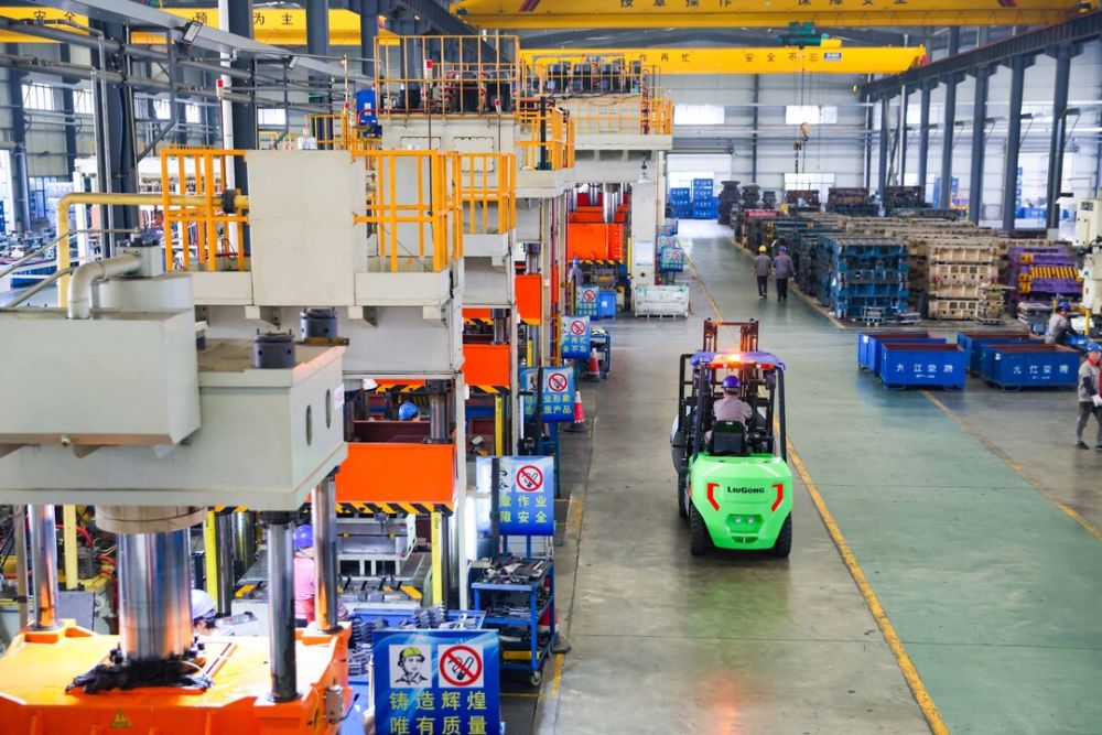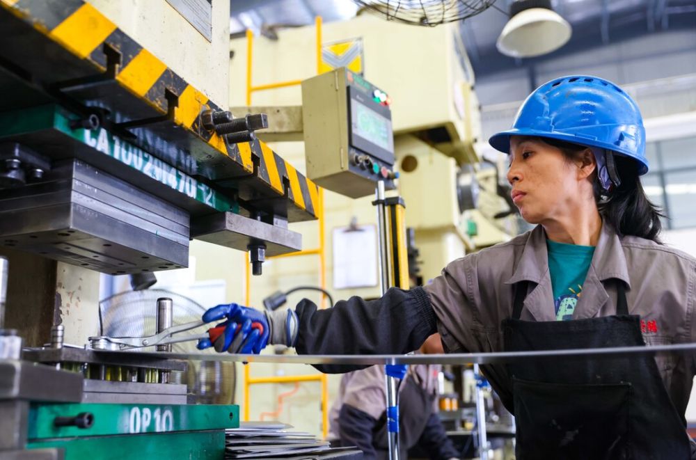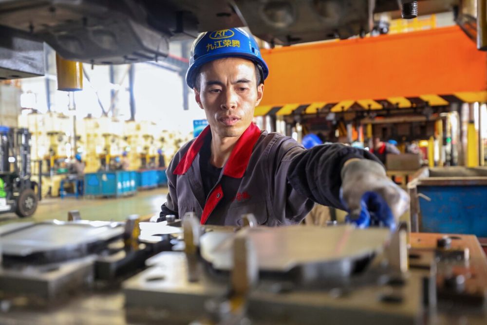 11月7日,庐山市工业园区的九江荣腾汽车部件有限公司生产车间内,工人们正在抓紧生产。