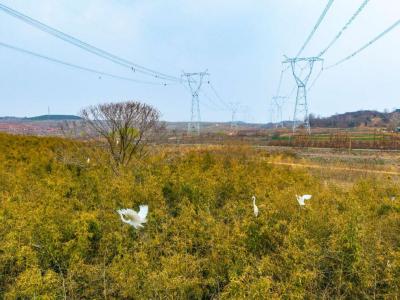 4月1日国际爱鸟日来临之际,山东省日照市岚山区黄墩镇浔河岸边,高大的杨树间,陆续归来的白鹭正衔枝筑巢。百米之外,国网山东省电力公司烟威1000千伏特高压线路工程的施工现场,最后一段导地线展放完毕。当白鹭结队掠过杆塔上空,这片工地已恢复宁静,只留下崭新的铁塔静静矗立,与鸟影相映成趣。