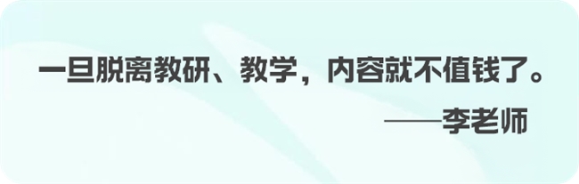 “老师真正教学用的课件,都是质朴但实用的。”李老师直言,“没必要花大量精力做花里胡哨的装饰,重要的是让下载的老师拿过来,直接就能用,不用再改。”他认为,“⼀旦脱离教研、脱离教学,你的这个内容就不值钱了”。